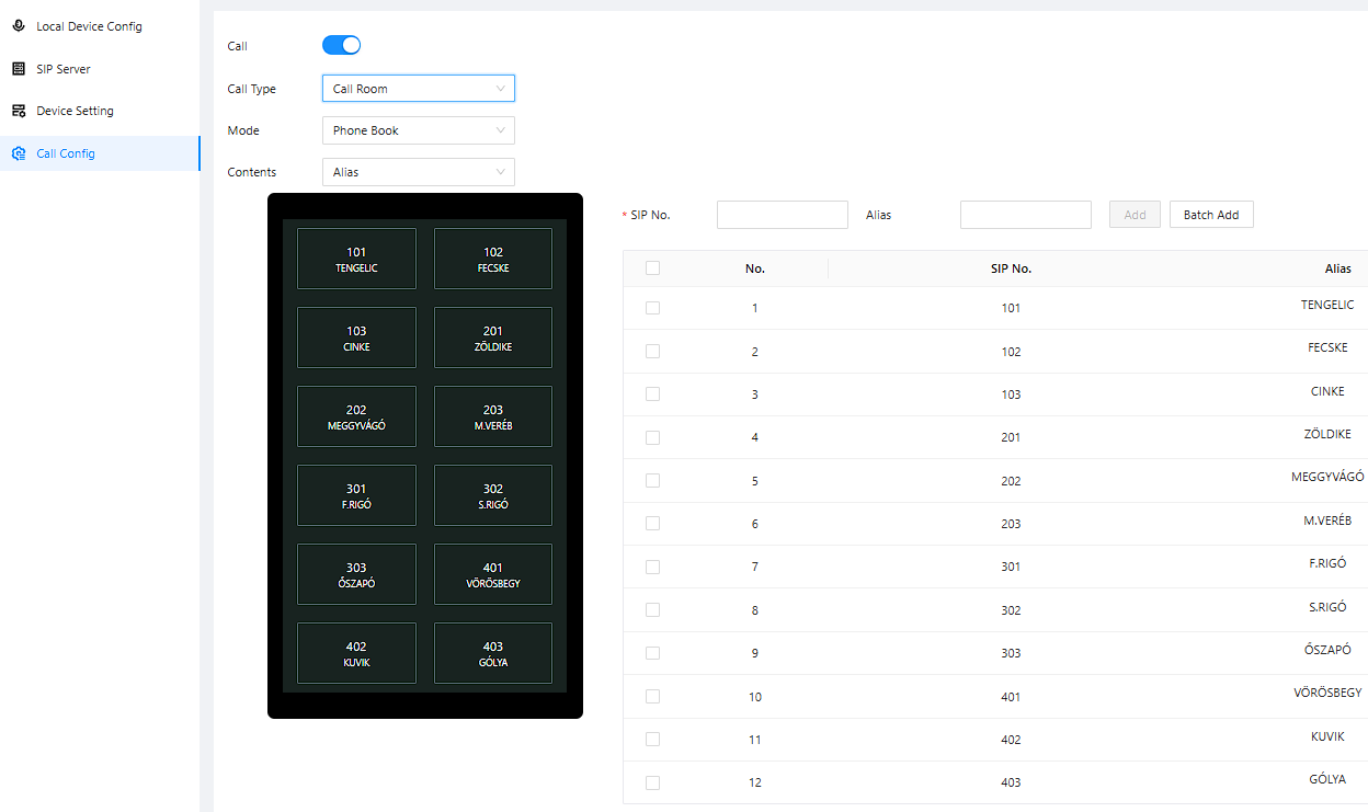 - Egyenként (1-5 számjegy), a -0, -1, -2 stb nem számít bele, viszont ha ilyen lakás számokat adunk meg, a Helyi eszközbeállítás menüben a Group Call-t (csoportos hívás) be kell kapcsolni.
